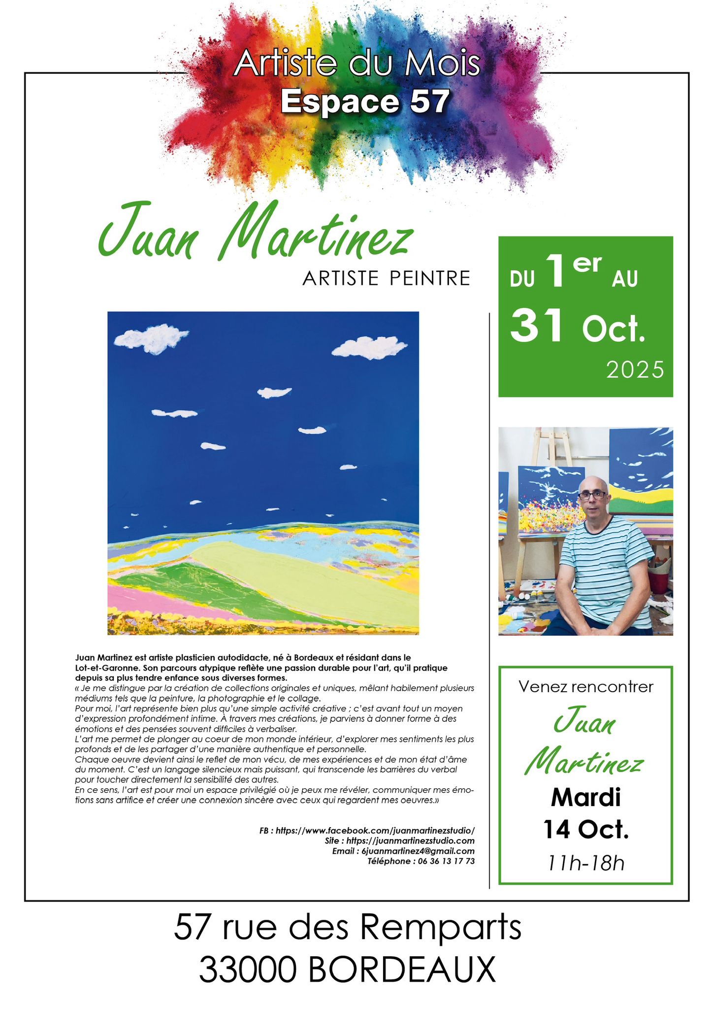 Exposition des œuvres de l'artiste Juan Martinez du 1er au 31 octobre 2025 à l’Espace 57, 57 rue du Rempart, Bordeaux.